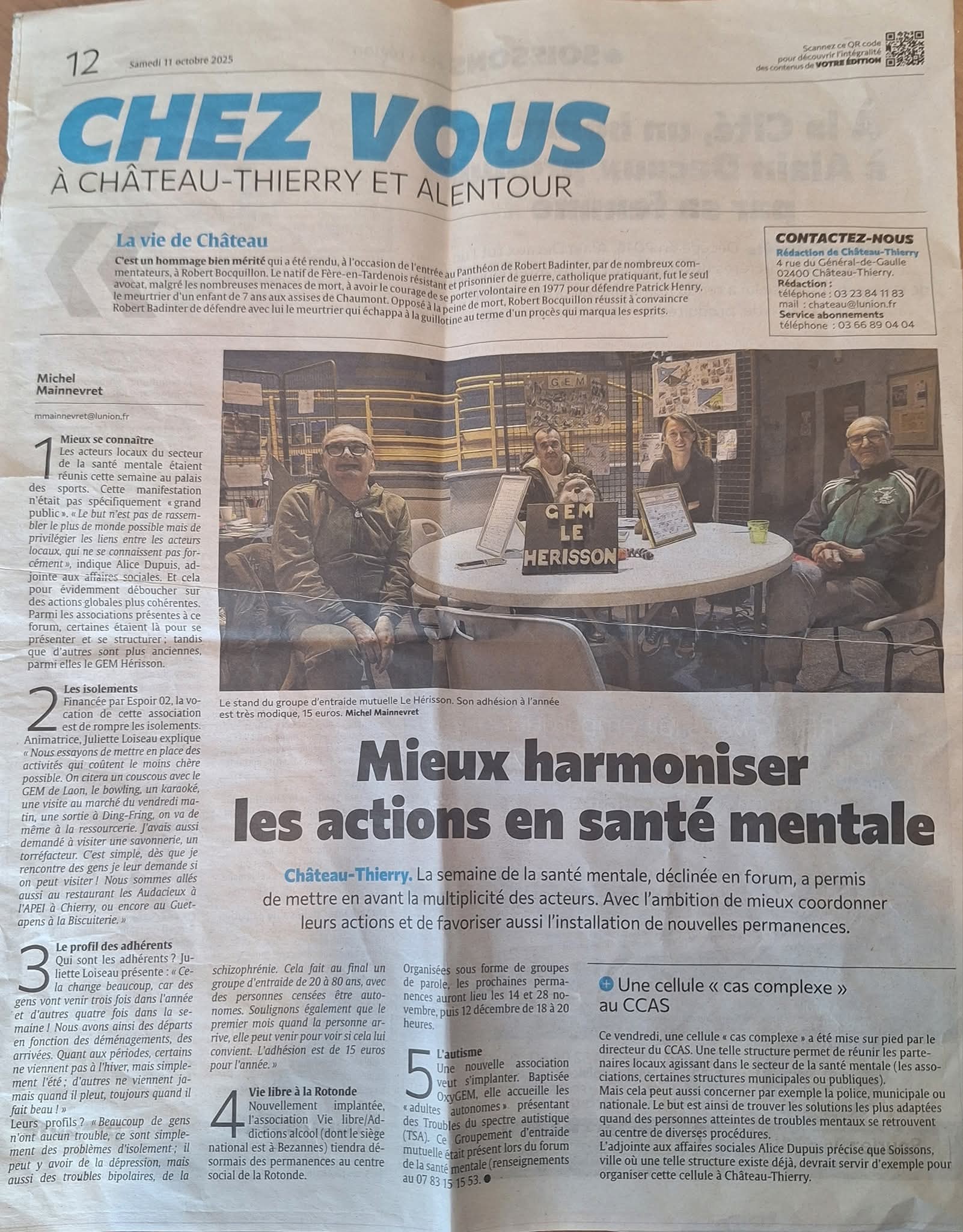 Le mercredi 15 octobre 2025, un événement similaire s’est tenu à Soissons. Ce Forum Santé Mentale réunissait différents acteurs locaux. Certains adhérents du Gem de Soissons, BB Ecolos dont la participation se répète annuellement, y étaient présents.